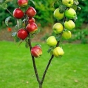 Std Dwarf Apple. Now here's a little beauty for a container or court-yard garden. Full sized, crisp and juicy, sweet tasting, red skinned apples that grow on a naturally dwarf tree. Grafted on to a standard to make a natural topiary. Self fertile with good disease resistance. Deciduous. TM.Apple Freyberg MM106